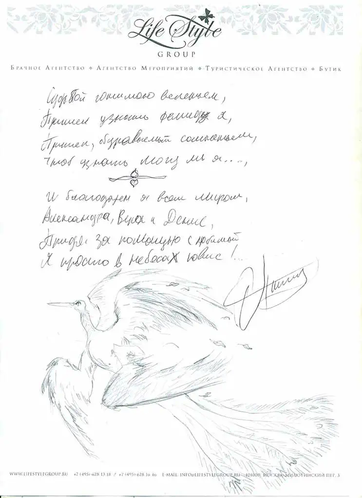 "Если Вы еще одиноки и мечтаете найти свою вторую половинку и быть такими же счастливыми как мы, то обращайтесь в компанию Life Style Group, где работают настоящие профессионалы, которые помогут Вам обрести свое счастье!"